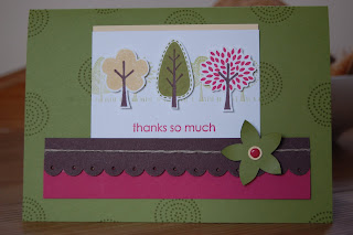 Here is the swap I made for the Demo Team Meeting last Saturday. I used Kraft as my base and inked the spiral tree in White Kraft Ink onto it. I used the Scallop Edge Punch to create a border at the bottom and pierced holes in each scallop using the Piercing tool. I stamped 3 tall trees from "Trendy Trees" in Old Olive and Chocolate Chip, hand cut them and used Dimensionals to adhere them to a piece of Rose Red Designer Series Paper which was matted with a layer of Chocolate Chip and Old Olive. My greeting is from "Sincere Salutations" which I stamped onto a piece of Kraft cardstock and layered with Old Olive and Chocolate Chip, piercing the ends for extra texture using the Mat Pack. I drew around one of the Die Cut blooms and layered two together and used the 1/4" and 1/2" circle punches along with an Old Olive Brad to centre the flower. I adhered the flower with a Mini Glue Dot onto a thin strip of Chocolate Chip cardstock at the top of the card base.